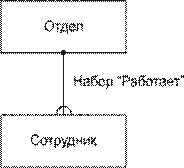 Сетевая модель данных опирается на математическую теорию направленных графов. Базовыми элементами сетевой модели являются : Элемент данных – минимальная информационная единица доступная пользователю. Агрегат данных – именованная совокупность элементов данных внутри записи или другого агрегата. Агрегат бывает двух видов – агрегат типа вектор и агрегат типа повторяющаяся группа . Например, агрегат <город, улица, дом, квартира>, которому можно присвоить имя Адрес, является агрегатом типа вектор. Примером, агрегата типа повторяющаяся группа может служить агрегат <месяц, сумма> с названием Зарплата. Агрегат повторяющаяся группа характеризуется числом повторений. В данном примере это число повторений равно 12. Запись - совокупность агрегатов или элементов данных, отражающих некоторую сущность предметной области. Например, записью будет <Фамилия, Зарплата>, где Фамилия – это элемент данных, а Зарплата – агрегат. Данную запись можно назвать Зарплата сотрудника. Тип записей – эта совокупность подобных записей. Например, в предыдущем случае типом записи будет совокупность всех записей Зарплата сотрудника, выражающая множество сотрудников некоторого отдела. Тип записей представляет (моделирует) некоторый класс реального мира. Набор - именованная двухуровневая иерархическая структура, которая содержит запись владельца и запись (или записи) членов. Наборы отражают связи «один ко многим» и «один к одному» между двумя типами записей. На рисунке 1. представлен пример набора. Здесь Отдел – запись–владелец, сотрудник - запись-член. Тип набора определяет связь между двумя типами записей. Каждый экземпляр типа набора содержит один экземпляр записи владельца и произвольное количество записей-членов. Среди всех наборов в сетевой модели допускается существование наборов, не имеющих владельцев. Такие наборы называются сингулярными . Владельцами сингулярных наборов формально считается система. Сингулярные наборы предназначены для доступа к экземплярам отдельных записей.