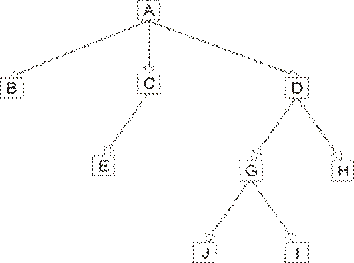 На рисунке 1.1 схематически представлена иерархическая структура. Узлы (сегменты) соединены друг с другом связующими дугами. Сегмент A является корневым сегментом. Сегменты B, E, H, J, I являются листовыми сегментами. Каждый сегмент, при этом, может содержать произвольное количество полей.