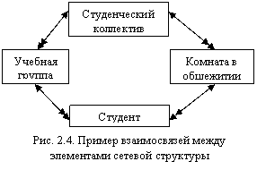 Отличие сетевой структуры от иерархической заключается в том, что каждый элемент в сетевой структуре может быть связан с любым другим элементом (см. рис. 2.3). Пример простой сетевой структуры показан на рис. 2.4.