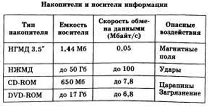 Технические характеристики различных устройств хранения информации: информационная емкость, скорость обмена информацией, надежность ее хранения (табл. 2).