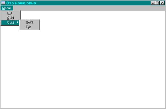 Меню можно создать тремя способами. Можно определить меню в файле описания ресурсов, создать меню без файла описания ресурсов непосредственно в программе с помощью функций CreatMenu, AppendMenu и InsertMenu или с помощью функции LoadMenuIndirect, создав предварительно структуру MENUITEMPLATE. Наиболее простым и понятным при программировании под Windows95 на языке ассемблера является определение меню в файле описания ресурсов с помощью любого текстового редактора.