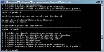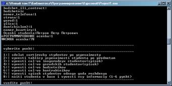 cout<<"\n 8:| naiti studenta v base i vyvesti vsy informaciy (1-6 pynkt)";