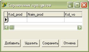 При активации модуля Spr_k_prod.db происходит активизация и открытие окна “Справочник продуктов”. Далее происходит формирование кнопок. При нажатии на кнопку “Добавить” управление передается в модуль Dob_prod.db. При нажатии на кнопку “Сохранить” управление передается в модуль Sohranit.db и измененные данные записываются в файл базы данных. При нажатии на кнопку “Удалить” управление передается модулю Udal_rec.db. При нажатии на кнопку “Отмена” управление возвращается модулю gl_menu.db.