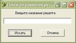 При выборе подпункта “Поиск по названию рецепта” появляется окно поиска (форма 9-Поиск по названию рецепта). Форма содержит поле для ввода названия и две кнопки “Искать” и “Отмена”.