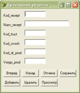 На форме есть кнопки: “Вперед”, “Назад”, “Отмена”, “Добавить” и “Просмотр”. При нажатии на кнопку “Вперед” происходит переход на рецепт со следующим кодом. При нажатии на “Назад” происходит переход на рецепт с предыдущим кодом. При нажатии на “Добавить” происходит очищение полей под новую запись и появляется форма 7-Добавить рецепт. При нажатии на “Отмена” происходит выход в главное меню. При нажатии на “Просмотр” появится форма 6- Рецепт с содержанием рецепта. При нажатии на кнопку “Удалить” удаляется данный рецепт. При нажатии на “Сохранить” рецепт сохраняется в таблицу Рецепты, в справочник и отчет. Можно вносить изменения во все поля, кроме поля Код рецепта (всегда проставляется автоматически).