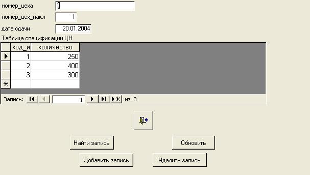 В этой работе используется главная кнопочная форма цеховые накладные, содержащая подчиненную форму Спецификации цеховых накладных.