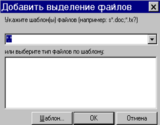 · Выделить группу…- выделить группу файлов, объединенных по какому-то признаку (по маске). Результатом работы команды является окно Добавить выделение файлов (рис. 3). Здесь необходимо указать шаблон, по которому будет произведено выделение