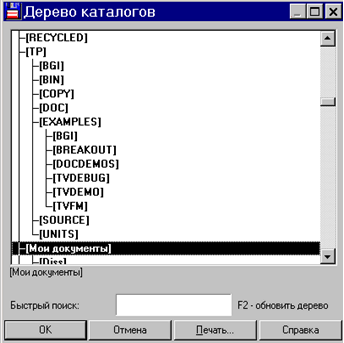 выводится окно, в котором помещено дерево каталогов диска, выведенного на текущей панели. При помощи этого окна можно быстро перейти в нужный каталог.