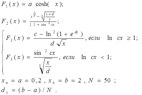 Суть этого задания состояла в построении таблицы значений и графиков функций, арифметических и логических выражений, в вычислении определенных интегралов этих функций с помощью формул трапеций и Симпсона.