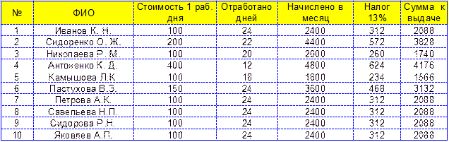 4. Таблицу Excel , в которой должен быть выполнен расчёт начисления заработной платы за один месяц сотрудникам подразделения из 10 человек.