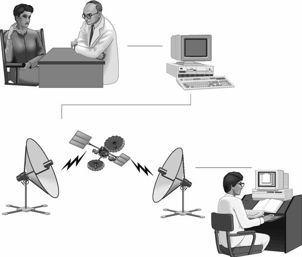 Простейшим видом удаленного консультирования является контроль и консультированиебольногомедицинскойсестройспомощьютелефоннойсвязи.Сложная телемедицинскаясистемаиспользуетинтерактивноевидеоиаудиоканалы.Онасостоитиз стандартных высокоскоростных телефонных линий, цифровых информационных технологий,компьютеров,периферическогооборудования,волоконнойоптики,спутников связи, программного обеспечения.
