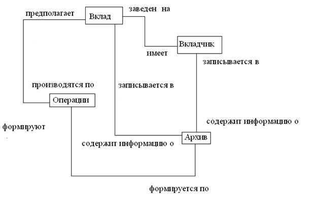 4. Архив - Вкладчик – с.с. М:1. Одна запись архива содержит одного вкладчика, а один вкладчик, поскольку может иметь несколько вкладов, может быть записан в архиве несколько раз.