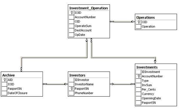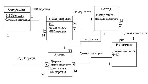 5. Операции - Архив – с.с. 1:М. Архив содержит закрытые вклады, то есть вклады, к которым применена операция Закрытие. Значит 1 операция соответствует многим (а именно всем) записям архива.