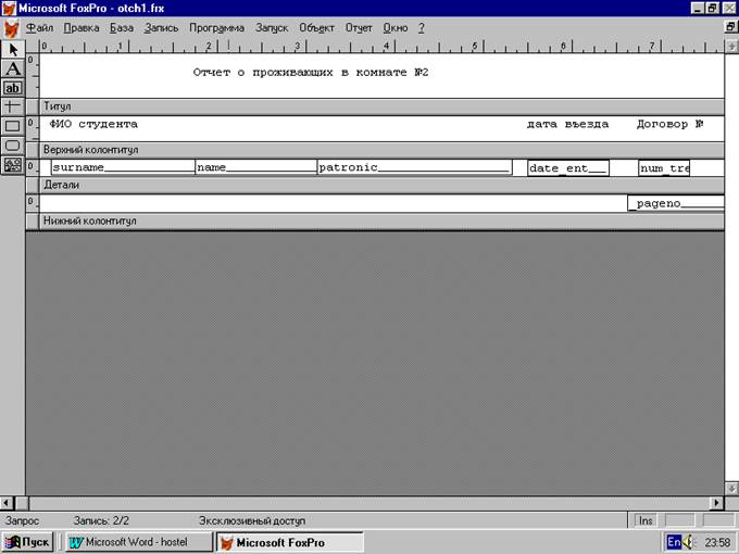 На рис 6. представлена схема отчета “Отчет о проживающих студентах в комнате №2”