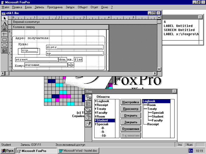 Предметная область: Управление общежитием, учет прибывших, убывших студентов, контроль над своевременной уплатой сумм за проживание в общежитие.
