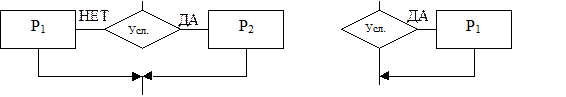 2) ЕСЛИ-ТО-ИНАЧЕ – это алгоритм, в котором задано некоторое условие. Если это условие выполняется (то есть оно истинно), то выполняется оператор P1 . Если это условие не выполняется (то есть оно ложно), то выполняется оператор P2 . Допускается укороченный вариант этого типового алгоритма. ЕСЛИ-ТО – это алгоритм, в котором при выполнении условия выполняется оператор P1 , а при невыполнении условия управление просто передается на следующий за данным блок (в данном случае типовой алгоритм ЕСЛИ-ТО не производит никаких действий).
