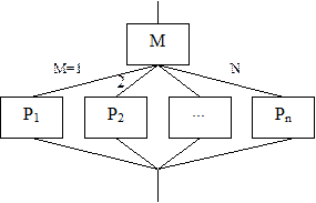 5) ВЫБОР – это алгоритм, в котором в зависимости от значения некоторой наперед определенной переменной (величины) M выбирается один из операторов P1 ,P2 ,…,PN и после его выполнения управление передается на следующий по порядку блок.