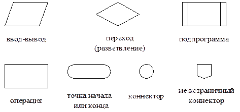 Существует несколько способов для описания алгоритмов, например, операторный способ, в виде блок-схем, на алгоритмических языках, на языках программирования и т.д. Большое распространение получила графическая запись структуры алгоритмов в виде блок-схем. Алгоритм в этом случае представляется графически в виде последовательности блоков, выполняющих определенные функции. Ниже представлены основные символы блок-схем: