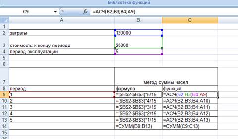 Функция рассчитывает суммы амортизационных отчислений за период 5 лет.