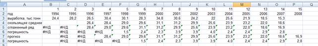 Имеются данные о выработке полезных ископаемых за 1994-2008 года. Необходимо сгладить временной ряд методом скользящей средней и составить прогноз на 2008 год.