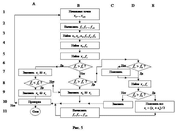 вершинах симплекса и перемещении симплекса в направлении оптимальной точки с помощью итерационной процедуры. В симплексном методе, предложенным первоначально, регулярный симплекс использовался на каждом этапе. Нелдер и Мид предложили несколько модификаций этого метода, допускающих, чтобы симплексы были неправильными. В результате получился очень надежный метод прямого поиска, являющийся одним из самый эффективных, если ![]()