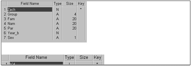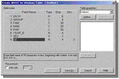 Например, для таблицы введём для последующих ссылок имена полей Zach , Group , Fam , Nam , Par , Year _ b , Sex , Pred , Oz , соответствующие указанным в ней заголовкам полей.