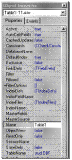 Name - имя объекта используемое в программе (является указателем, заданным в соответствии с шаблоном компоненты); DatabaseName - имя псевдонима (alias) базы данных (выбирается из списка, если таблица и проектнаходятся в одном каталоге необязательный параметр!); TableName - имя файла таблицы (выбирается из списка, если указан псевдоним БД или файл с таблицей и проект находятся в одном каталоге); Active - позволяет отображать данные из таблицы в процессе разработки и автоматически открывает файл при выполнении (когда установлено true).