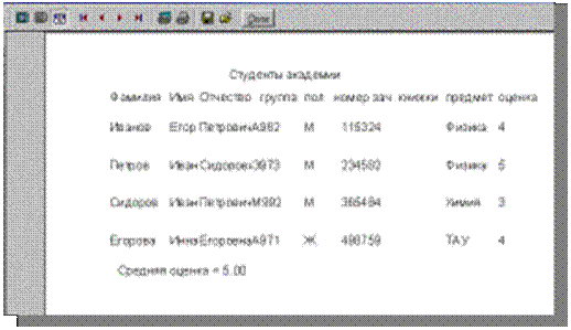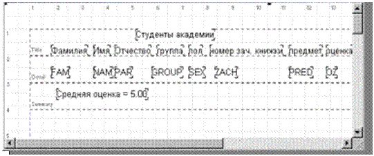 Макет формы печати данных таблицы stud.dbf и рассчитанной средней оценкипредставлен на рис. 3.