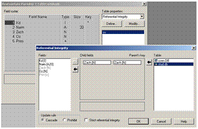 Для организации связи 2-х таблиц с помощью DataDesktop в окне задания структуры, когда в нем находится структура подчиненной таблицы (в нашем случае, ozen . db ), следует у списка Table properties (характеристики таблицы) выбрать значение Referential Integrity (ссылочная целостность), после чего определить Define связь. В открывшемся окне задаем характеристики связи таблиц, выбрав в левом окне поле для организации связи, в правом – имя требуемой таблицы (двойным щелчком мыши). Естественно, что количество выбранных полей из каждой таблицы и их типы должны совпадать .
