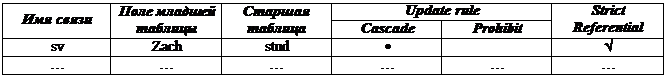 Здесь же можно задать характеристики связи: 1) правило обновления (updaterule) – для определения варианта обновления значений в подчиненной таблице при изменении или удалении связанных значений в основной (каскадный, запрещенный); 2) выключатель защиты целостности (strictreferentialintegrity) – для определения невозможности изменения данных в таблицах, для которых установлена ссылочная целостность. После определения параметров связи задаем имя связи.