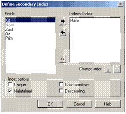 Для задания вторичных индексов с помощью DBD, следует у списка Table properties (характеристики таблицы) выбрать значение Secondary Indexes (вторичные индексы), после чего определить Define поля, используемые в индексе, их последовательность (!!!) и ряд характеристик: 1) уникальность (unique); 2) режим обновления (maintained); 3) чувствительность к регистру (casesensitive); 4) порядок сортировки (descending). По завершению формирования индекса задаем имя индекса.