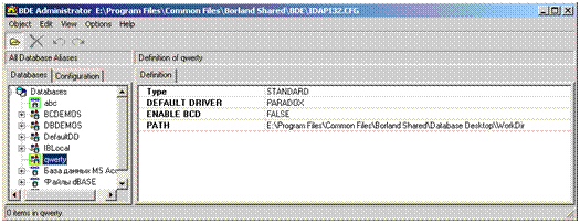 Для задания псевдонима можно воспользоваться утилитой BDEAdministrator, поставляемую в составе большинства продуктов корпорации Inprise (Borland). Утилита BDEAdministrator находится в меню "Пуск"Прог paммы -> Borland Delphi -> BDE Administrator .