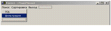 Теперь разместив на форме диалога компонент Menu с палитры компонентов Стандарт , сформируем простое меню, задавая названия пунктов меню свойству Items . Для Поиск – подменю: SQL и фильтрация , для Сортировка – по фамилии , по наименованию дисциплин и пункт Выход . Обратите внимание на порядок задания имен, в свойстве Name каждого пункта будет отображен этот номер.