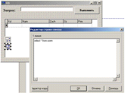 ПеренеситенаформукомпонентыQuery1 (вместо Table1), DataSource1 , DBGrid1 исоединитеихобычнойцепочкой: вDBGrid1 задайтесвойствоDataSource равнымDataSource1 , авDataSource1 задайтесвойствоDataSet равнымQuery1 . Компонент Query 1 настройте на таблицу ozen . Для этого установите свойство DataBaseName на псевдоним qwerty , а в свойстве SQL напишите оператор: select * from ozen .