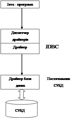 На рис.2.1. показана схема підключення Java-програми до бази даних. Клас DriverManager має структуру даних, яка містить як самі драйвери у вигляді об'єктів Driver, так і інформацію про них.