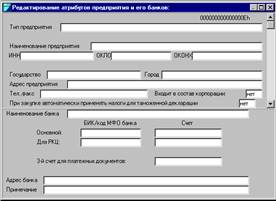 Сведения обо всех организациях (включая собственную) содержатся в каталоге "Организации и банки" В модуле "Настройка" заполните этот каталог. Если в каталоге уже есть информация, Вы увидите список организаций, если каталог еще не заполнен, то на экране появится запрос "Введите информацию о собственной организации".