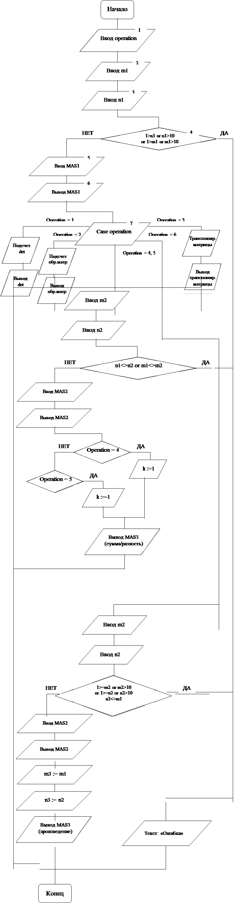 После запуска программы, пользователю предлагается выбрать требуемую операцию: нахождение определителя, обратной матрицы, транспонированной матрицы, сложение или вычитание двух матриц, умножение двух матриц. Это производится по средствам ввода пользователем цифры, соответствующей данной операции. Далее следует запрос о размерах данной матрицы (кол-ве строк и столбцов), после ввода которых программа проверяет, чтобы введенные значения не были отрицательными или не превышали допустимых размеров матрицы (в программе – 10х10). В случае, если перечисленные условия не выполняются, на экран выводится сообщение об ошибке, и программа завершает работу. При выполнении условий, пользователю предлагается ввести с клавиатуры исходную матрицу «А» (в программе – MAS1). Ввод производится построчно, для перехода к следующей строке, пользователю необходимо нажать клавишу «ENTER». После того, как число строк становится равным числу, введенному пользователем, ввод матрицы прекращается. Введенная матрица выводится на экран для проверки. Далее следует проверка «пригодности» введенной матрицы к операции, выбранной пользователем, в случае «непригодности» матрицы, на экран выводится сообщение об ошибке, и программа завершает работу. В случае «пригодности» матрицы, над ней производится выбранная операция, после чего на экран выводится сообщение о результате. Если пользователем была выбрана операция, требующая вторую матрицу «В» (в программе – MAS2), пользователю предлагается ввести ее размеры, как и при вводе матрицы «А», далее программа проверяет, возможно ли проведение выбранной операции над матрицами с введенными параметрами. Если операция невозможна, то на экран выводится сообщение об ошибке, и программа завершает работу. Иначе, операция выполняется, и ее результирующая матрица «С» (в программе – MAS3) выводится на экран.
