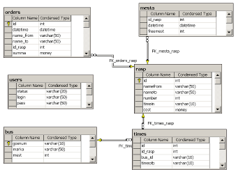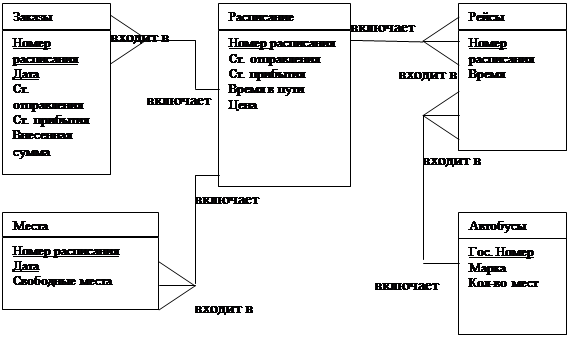 База данных работает под управлением СУБД MS SQL server 2000. Используется много поточный доступ к базе данных. Необходимо обеспечить одновременную работу с программой. База данных будет содержат информацию об автобусах (гос. номер, марка, число мест), расписание маршрутов (откуда, куда, время поездки, цена билета, номер рейса), расписание рейсов, информация о заказанных билетах.