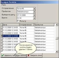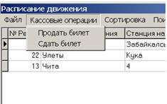 Возникают ситуации, когда пассажир в силу сложившихся для него неблагоприятных ситуациях не может поехать. Он сможет сдать заранее купленный билет в кассу не позже чем за пол часа до отправки. Для этого кассир выбрав из пункта меню кассовые операции пункт сдать билет. Появляется форма, где кассир выбирает из ниспадающих списков пункты отправления, прибытия, дату и время.