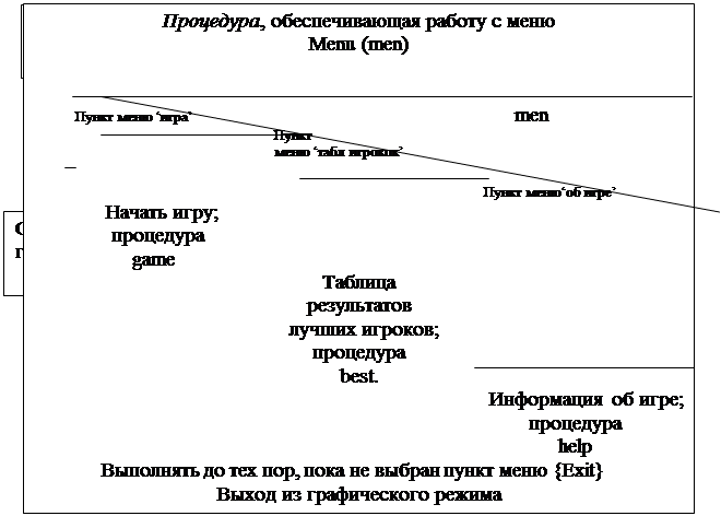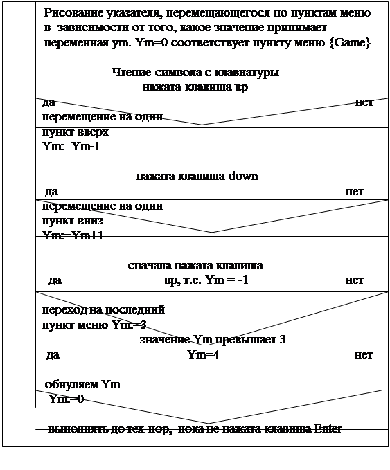 В первую очередь она обеспечивает интерфейс меню программы <15> и работу с ним пользователя. На экране игрок наблюдает меню, состоящее из 4-x пунктов. Выбор того или иного пункта осуществляется с помощью стандартных клавиш (up,down), что не сомненно очень удобно для любого пользователя, работающего с данной программой. Перемещение по пунктам меню осуществляется посредством цикла с постусловием. В теле цикла располагается несколько операторов условного перехода. В зависимости от того, какая клавиша нажата(up или down), переменной присваивается некоторое значение. После этого координаты указателя изменяются, и он становится на соответствующий пункт (в качестве указателя выступает закрашенный прямоугольник, цвет которого отличается от цвета пунктов меню). Далее проверяется условие выхода из цикла. Если нажата клавиша Enter, то осуществляется выход из цикла, иначе пользователь выбирает другой пункт меню. Таким образом, перемещение по пунктам меню происходит до тех пор, пока не нажата клавиша ввода.