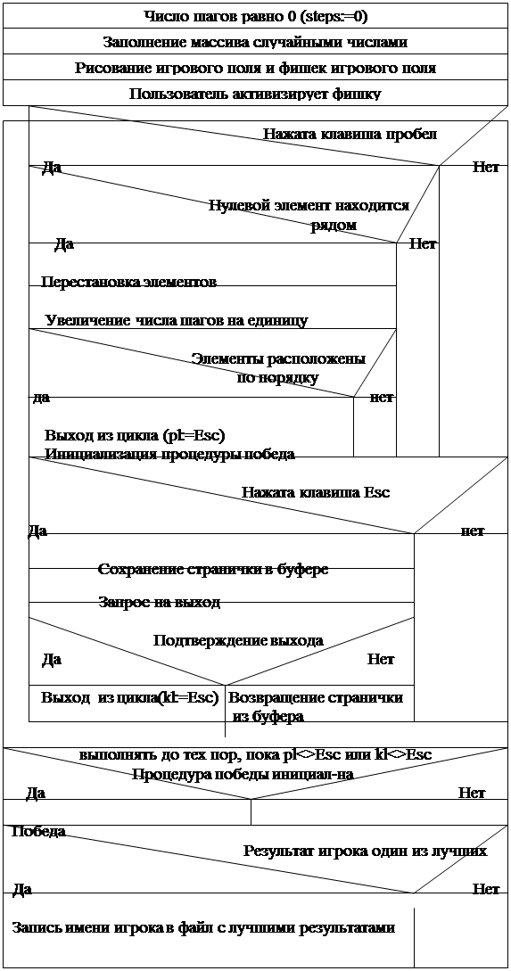 В процессе игры программа должна фиксировать число перемещений фишек сделанных игроком. После того, как фишки будут расположены по порядку, программа сравнивает результат с другими результатами и, если он превосходит один из рекордов, то сразу заносится в таблицу результатов. Рассмотрим, каким образом программа может быть построена с математической (логической) точки зрения. Для этого определимся с теми действиями, которые должна будет выполнять программа:1. Формирование одномерного массива содержащего 16 элементов 2 . Заполнение массива числами 1, 2, 3, 4, ... 15 (один элемент массива остается пустым, он будет в дальнейшем представлять пустую клеточку) Элементы массива задаются случайным образом, с помощью генератора случайных чисел 3. Иизменение пользователем порядка расположения чисел в массиве4. Подсчет количества перемещений элементов в массиве5. Проверка расположения элементов в массиве.