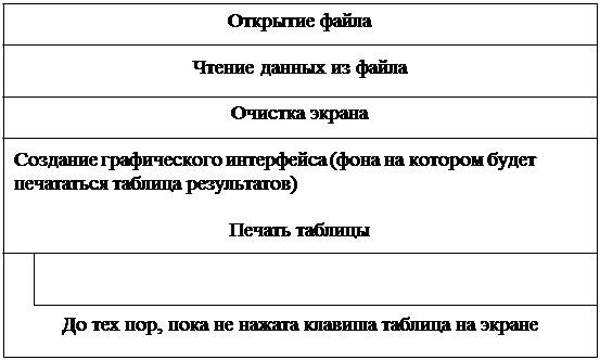 После этого следует процедура очистки экрана. Затем происходит создание фона, на котором будут выводиться данные из файла. Распечатка осуществляется без выхода из графического режима, благодаря чему таблица получается красочной и приятной для восприятия. В текстовом режиме создать такой эффект невозможно. Имя игрока и его результат разделяются точками. Имя игрока, имеющего лучший результат, выделяется другим цветом.
