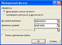 При желании, можно задать также диапазон ячеек, куда следует помещать результаты фильтрации, если вы не хотите фильтровать список на месте. Имеется также возможность отображать в результатах только уникальные записи. То есть, если таблица содержит множество повторяющихся записей, то результат будет содержать только по одному экземпляру от каждой. Для снятия расширенного фильтра нужно выбрать в меню Данные опции Фильтр и Отобразить все .