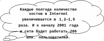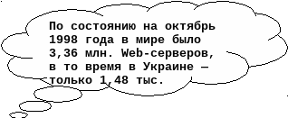 Теперь кратко остановимся на информационных ресурсах сети Internet и ее украинского сегмента. Сейчас все большее число компаний и отдельных пользователей понимают, какие широкие возможности по получению информации для служебных, профессиональных и бытовых потребностей предоставляет Internet. Internet не только обеспечивает доступ к огромным информационным ресурсам, но и значительно повышает производительность труда во многих секторах экономики и науки (простота поиска, оперативность получения информации и обмена данными, доступность экспертных оценок и др.). По некоторым данным, на Web-серверах в Internet сейчас располагается более 200 млн. страниц и каждые 4—6 месяцев этот объем удваивается. А что же в Украине на конец 1999 года?