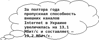 Напомним, что полтора года тому назад суммарная пропускная способность внешних каналов Internet составляла всего 6,1 Мбит/с. На сегодня пропускная способность внешних каналов Internet в Украине увеличилась на 13,1 Мбит/с и составляет 19,2 Мбит/с.