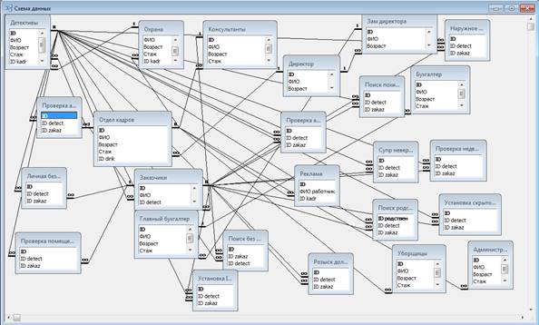 - Таблица «Детективы», которая содержит: IdДетектива, Ф.И.О., возраст, стаж, Id охраны, Id отдела кадров.