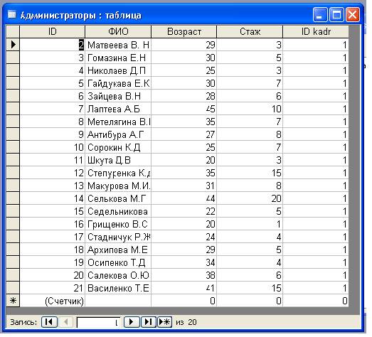 - Таблица «Администраторы», которая содержит: IdАдминистратора, Ф.И.О. , возраст, стаж, Idотдела кадров.