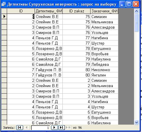 - Таблица «Супружеская неверность», которая содержит: Id по порядку, Id детектива, Id заказчика.