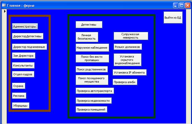 При запуске системы происходит открытие Главной (стартовой) формы на которой располагается 23 кнопки, 1 кнопка с надписью «выход» при ее нажатии происходит выход из БД. Каждая из кнопок открывает следующую форму, в которой представлена в удобном виде информация нужная пользователю.
