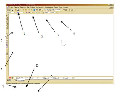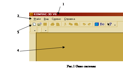 1 – Строка заголовка. Содержит название системы, имя документа и кнопки управления окном системы.2 – Строка меню. Содержит заголовки страниц команд меню и кнопки управления окном документа. Основные страницы меню.